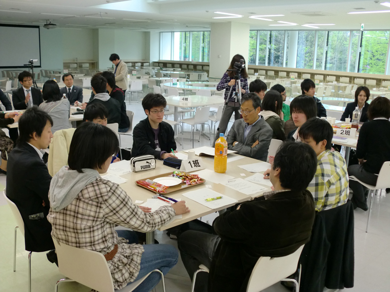 お菓子などをつまみながら、大学生の学内マナーについて話し合い、様々な意見が出されました。